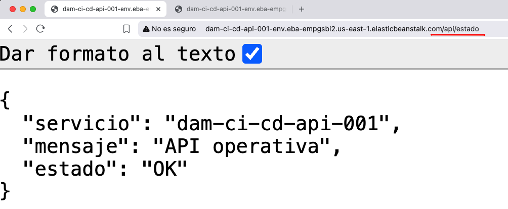 Una vez finalizado el pipeline, se comprueba el correcto funcionamiento de la aplicación accediendo a: